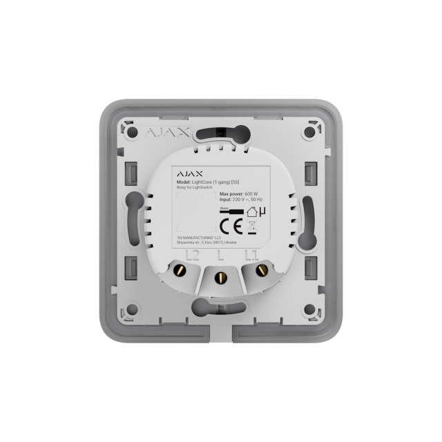 Releu Ajax LightCore (1-gang) pentru comutator de lumină tactil cu o singură tastă LightSwitch. Compatibilitate butoane: SoloButton (1-gang / 2-way), CenterButton (1-gang / 2-way), SideButton (1-gang / 2-way). Compatibil cu Hub Plus, Hub 2 (2G), Hub 2 (4G), Hub 2 Plus, Hub Hybrid (2G), Hub Hybrid (4G), ReX, ReX 2. Tensiune de alimentare: 230 V, 50 Hz. Consum mediu: până la 200 mW. Putere maximă de comutare: 600 W. Protecție la curent: mai mult de 2,6 A. Protecție la temperatură: mai mult de +60°C