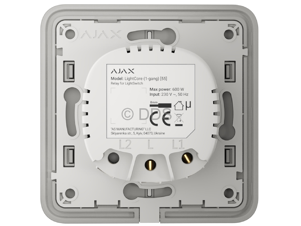 Releu Ajax LightCore (2-gang) pentru comutator de lumină tactil cu două taste LightSwitch. Compatibilitate butoane: SoloButton (2-gang), CenterButton (2-gang), SideButton (2-gang). Compatibil cu: Hub Plus, Hub 2 (2G), Hub 2 (4G), Hub 2 Plus, Hub Hybrid (2G), Hub Hybrid (4G), ReX, ReX 2. Tensiune de alimentare: 230 V, 50 Hz. Consum mediu: până la 200 mW. Putere maximă de comutare: 600 W. Protecție la curent: mai mult de 2,6 A. Protecție la temperatură: mai mult de +60°C