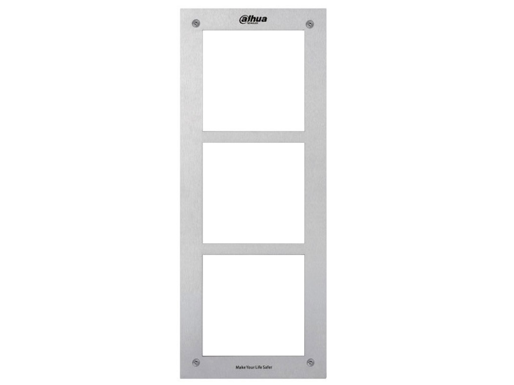 VTOF003 Cadru de montaj si decorativ pentru 3 module Dahua VTO2000A-x. Rama este realizata din otel inoxidabil de inalta calitate de culoare argintie. Dimensiuni: 369x145x11 mm. Greutate: 600 g